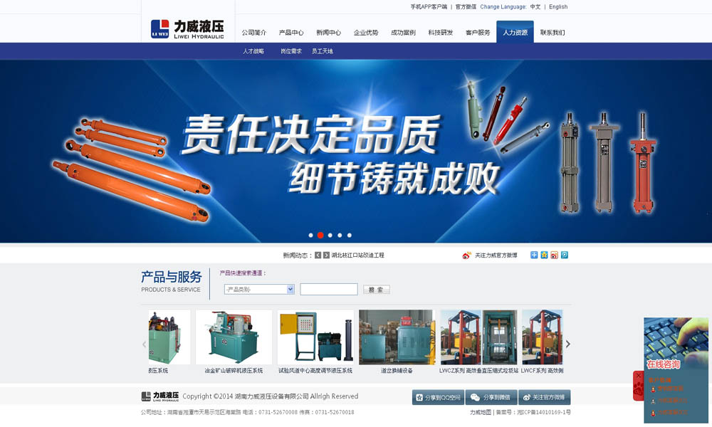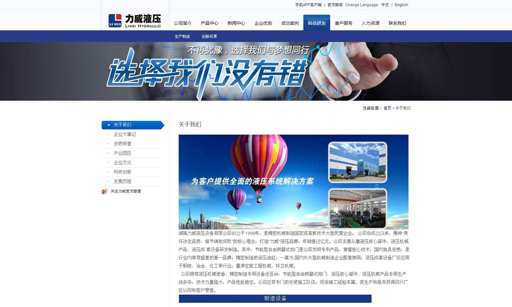 湖南力威液压设备有限公司创立于1998年,是精密机械制造国家级高新技术大型民营企业。 公司自成立以来,秉持“责任决定品质、细节铸就成败”的核心理念,打造“力威”液压品牌,年销售过亿元。公司主要从事液压核心部件、液压机械产品、液压成 套设备研发制造。其中,节能型自由侧翻式拍门是公司发明专利产品,掌握核心技术,国内独具资质,是行业内享有盛誉的第一品牌;精密制造的液压油缸,一直为 国内外大型机械制造企业配套使用;液压成套设备广泛应用于钢铁、冶金、化工等行业;量身定做工程机械、环卫机械。