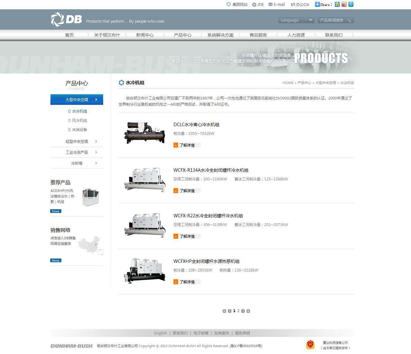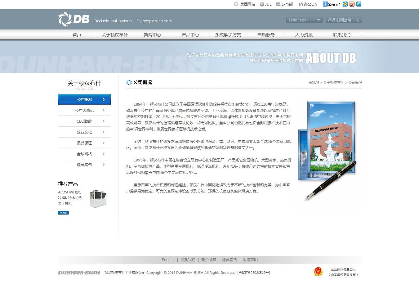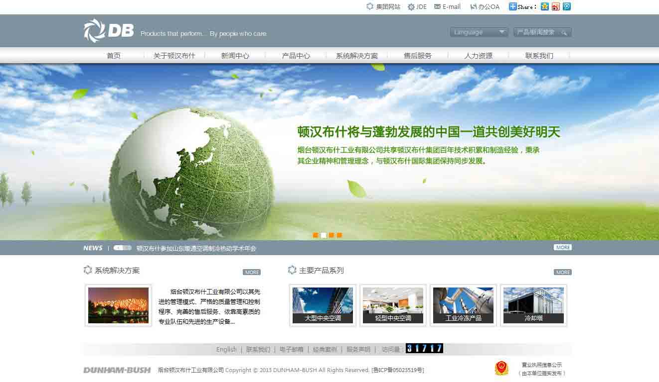 1995年,顿汉布什中国在烟台设立研发中心和制造工厂,产品线包含压缩机、大型冷水、热泵机组、空气侧换热产品、小型商用空调机组、低温冷冻机组、冷却塔等;快捷迅速的售前技术支持和售后服务网络覆盖中国46个主要城市和地区…