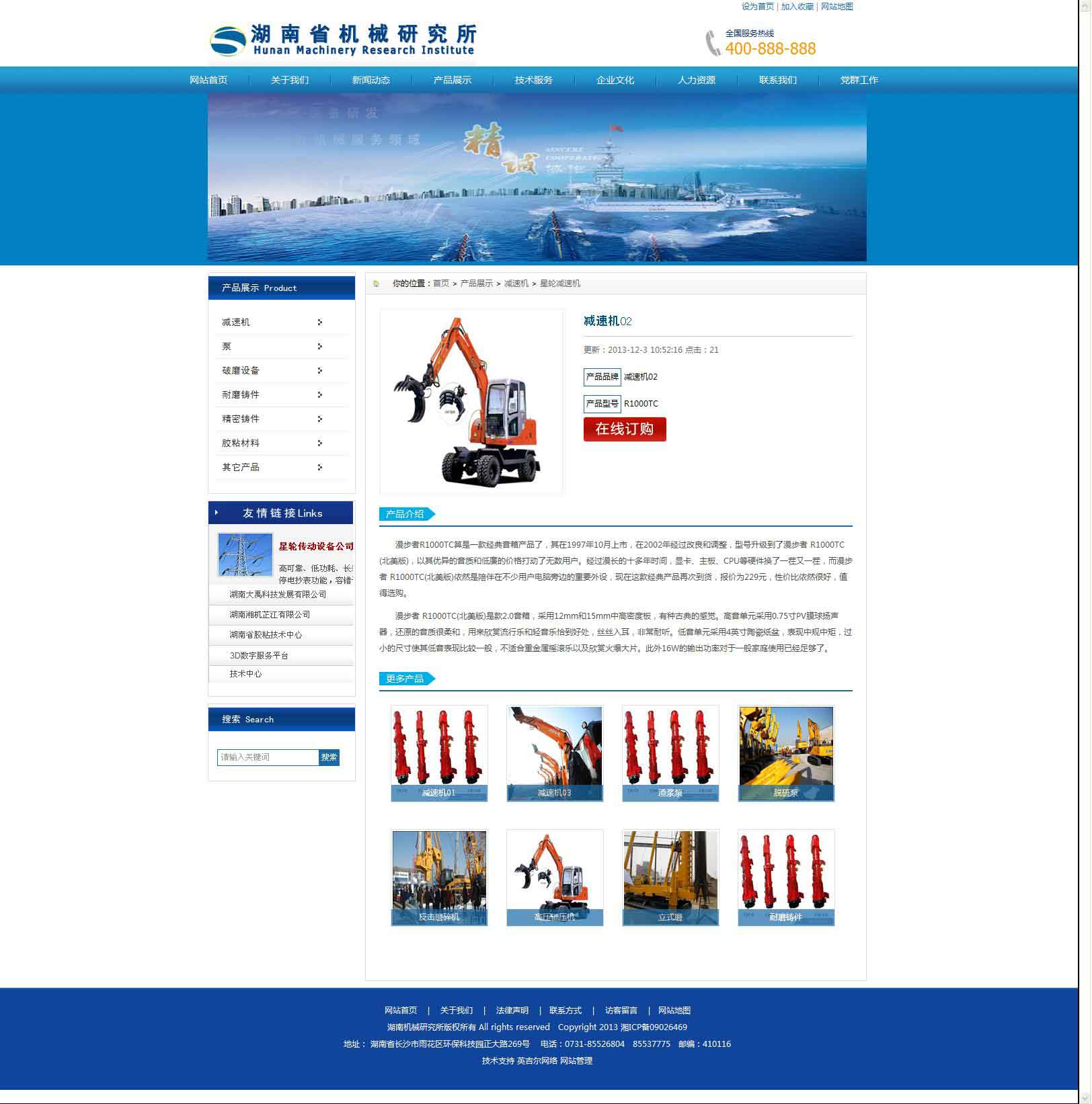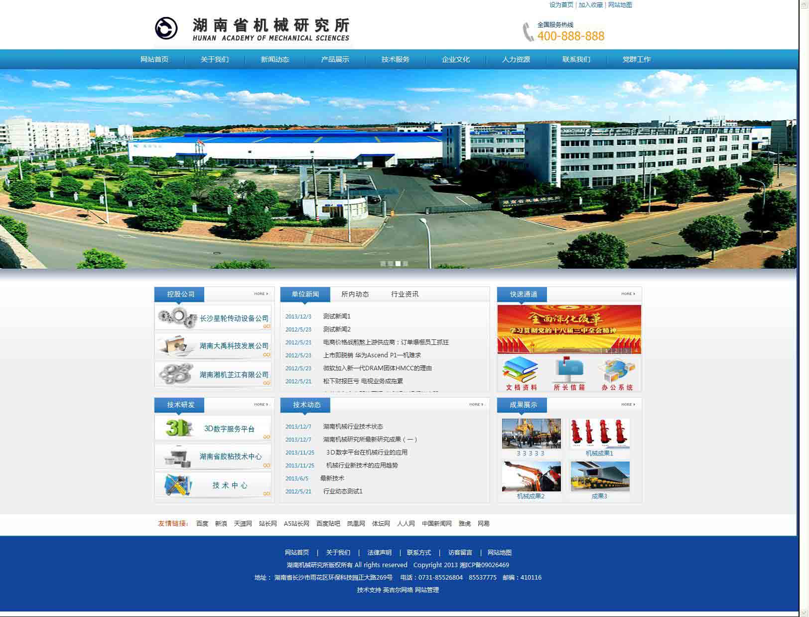 湖南省机械研究所成立于1959年。位于湖南环保科技园正大路269号,占地46亩,拥有1万平方米标准生产厂房及各类高精机加工和检测设备上百台套和5千平方米科技大楼。是主要从事机械行业的新技术、新材料、新工艺、新产品的研究、发明、设计、开发、推广应用的综合研究所,为省高新技术企业。