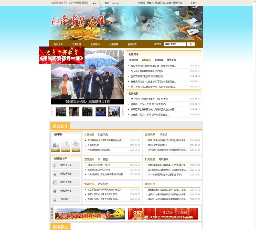 湖南省水库移民局门户网站是湖南省水库移民开发管理局领导亲自关心、指导下建立和发展起来的水库移民局门户网站,这是一个依托因特网,集“对外宣传、政务公开、网上办事、公共服务、互动交流”功能于一体的水库移民局门户网站。是展示湖南省水库移民开发形象的总窗口,为民服务的总平台,联系群众的现代化桥梁。